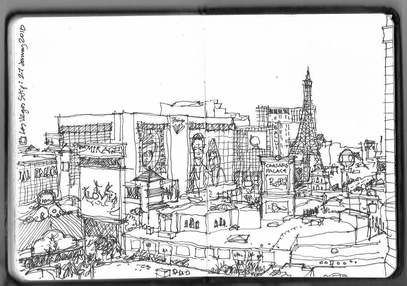 I draw especially when travelling – sitting in airports or train stations is good. Another place is hotel windows. I have done many drawings from hotel windows. When you enter your hotel room (a temporary home for twenty-four hours, sometimes less, sometimes more) you typically walk to the window and look at the view. The next time you do that it might be brushing your teeth after breakfast (although TVs typically take up your attention for that too). Drawing the view from the window makes you really look – really look. It also makes you more ‘picky’ about the rooms you will accept from the hotel receptionist. The one in the Chicago Y I just got, but the one in Caesars Palace, Las Vegas I had to make the mile long trek back to the front desk to ask for.